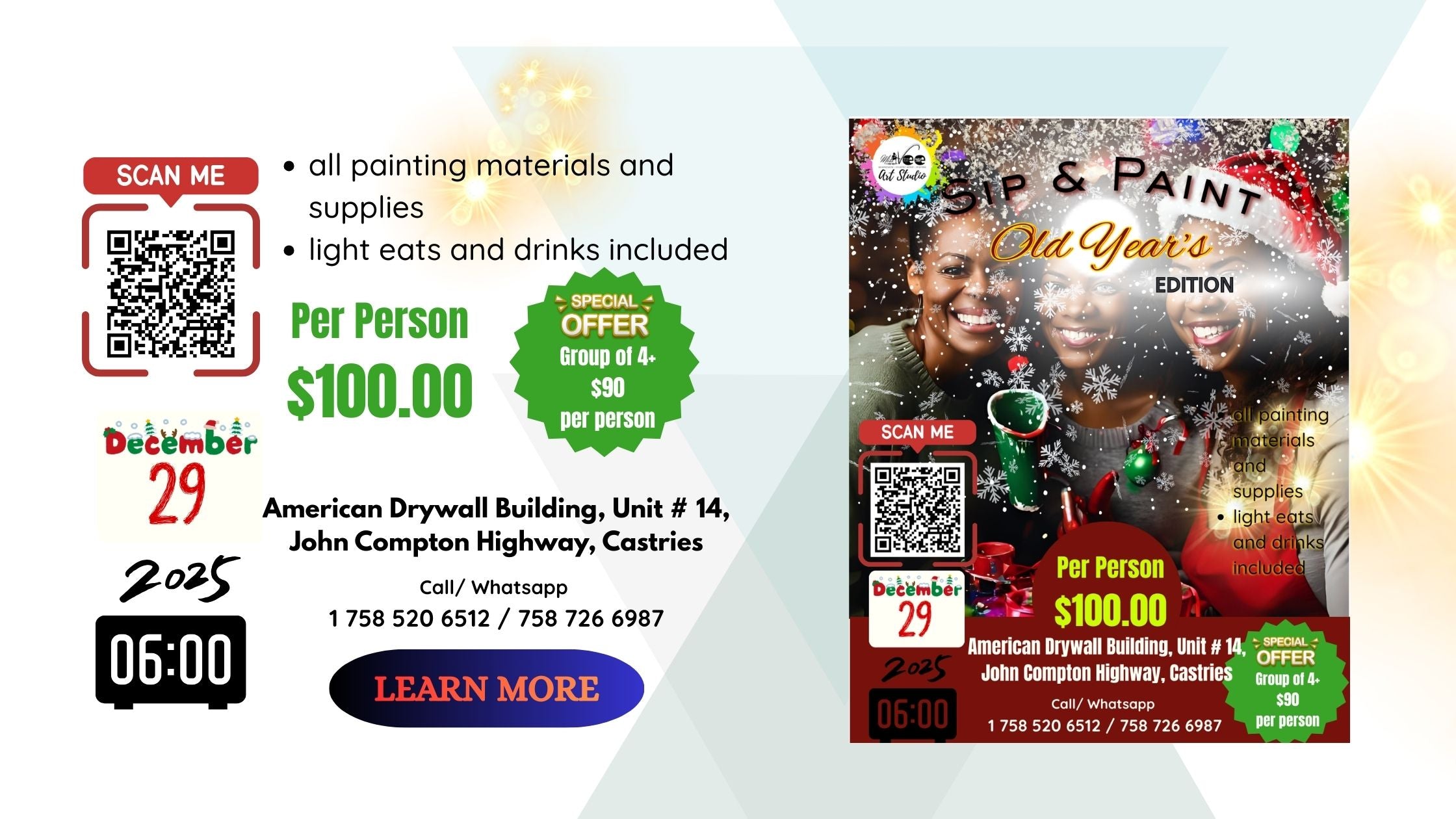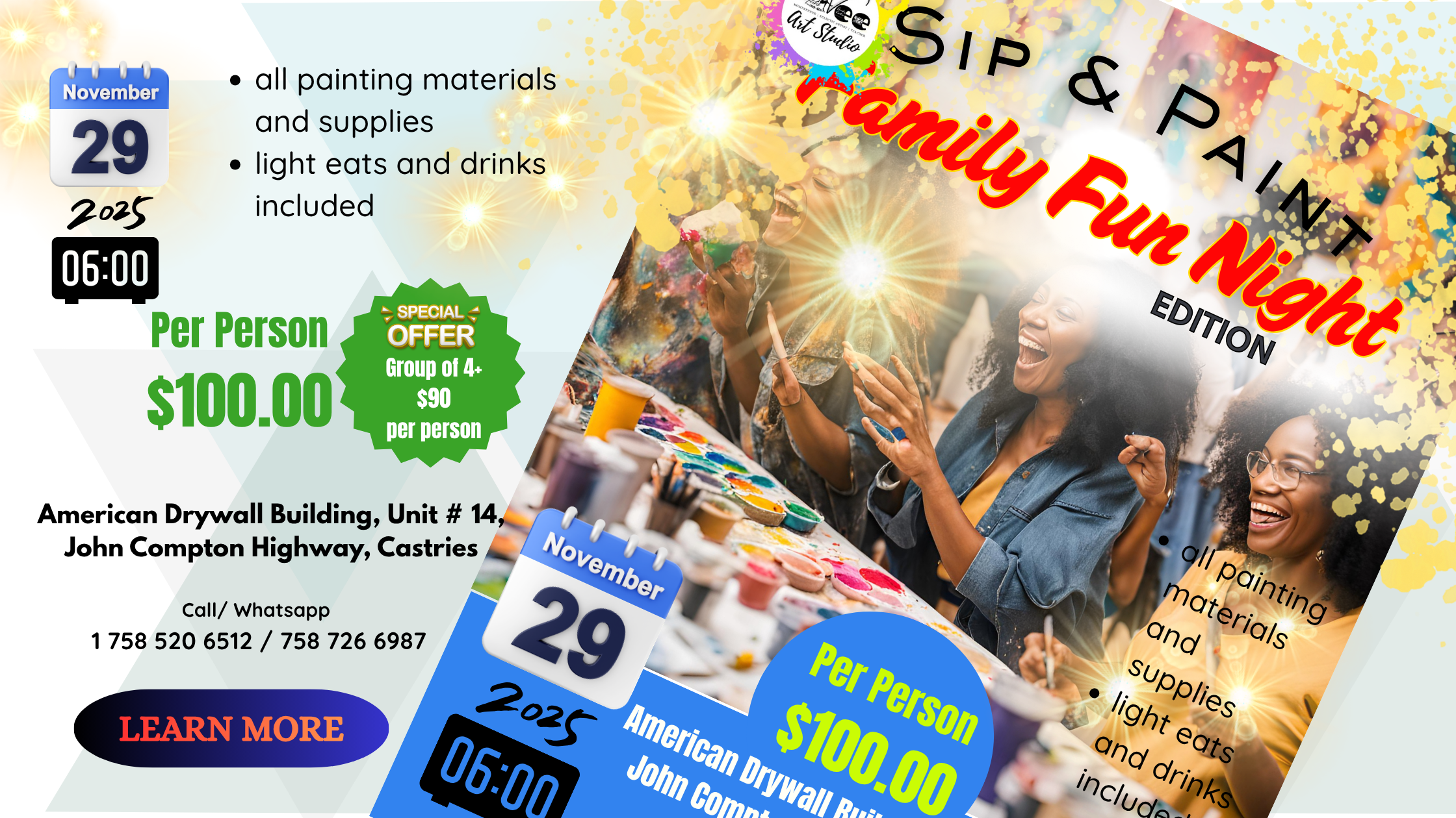Our vibrant art space in Saint Lucia offers a range of experiences, from painting workshops and themed Sip & Paint parties to creative merchandise and original artwork.